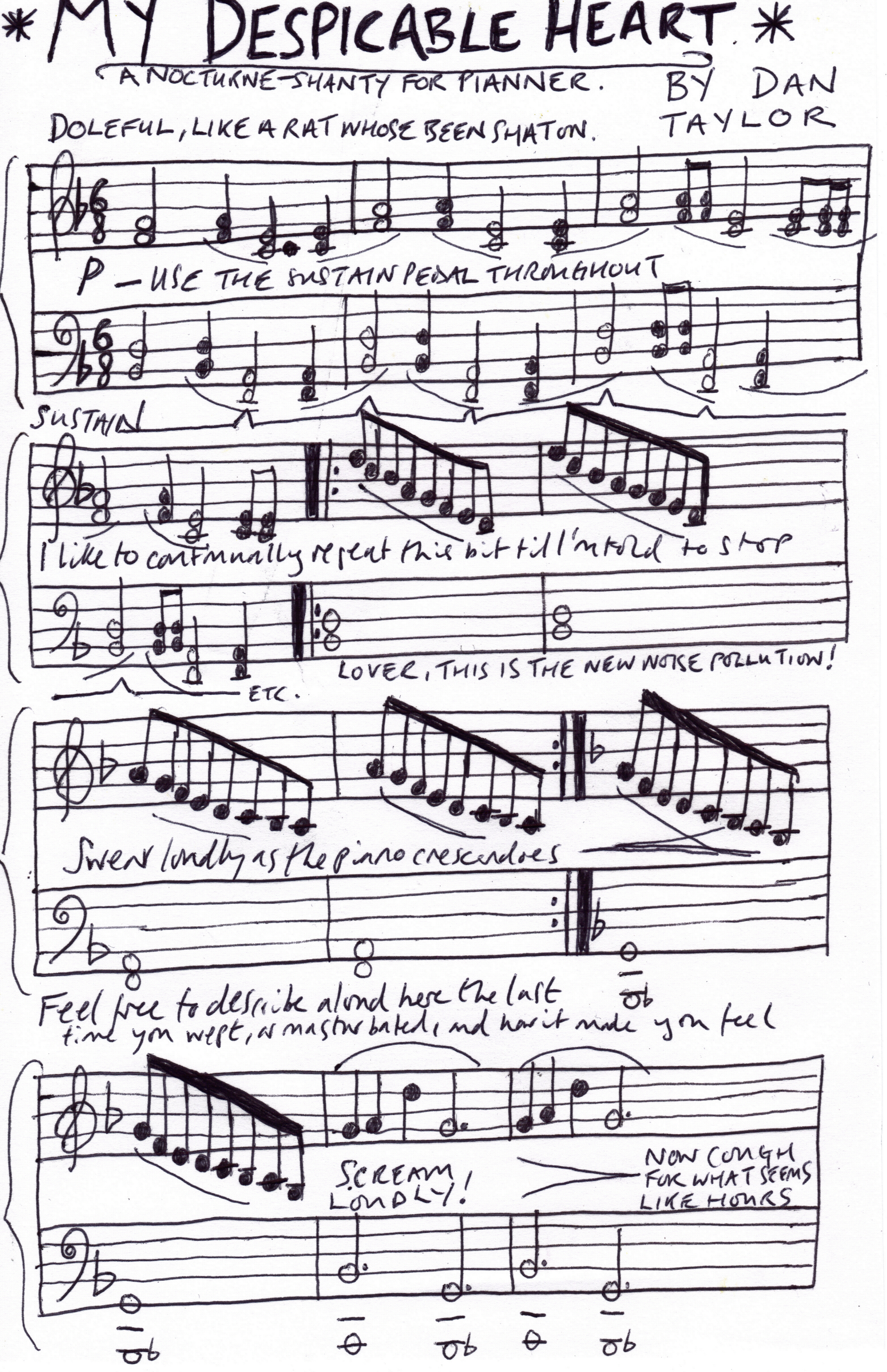 How’s that for a headline? I would’ve gone for My Despicable Heart but it doesn’t have as much panache. Tonight it’s a confessional fit only to be heard very late at night and on your own. This is a song for piano which I wrote, and which after probably never being heard in its entirety before (maybe half – once), I recorded tonight. The quality is bad, with only my basic mp3 player and my digital camera to hand. It gives a sense of the song anyway.