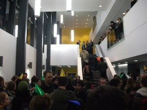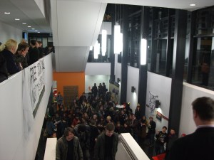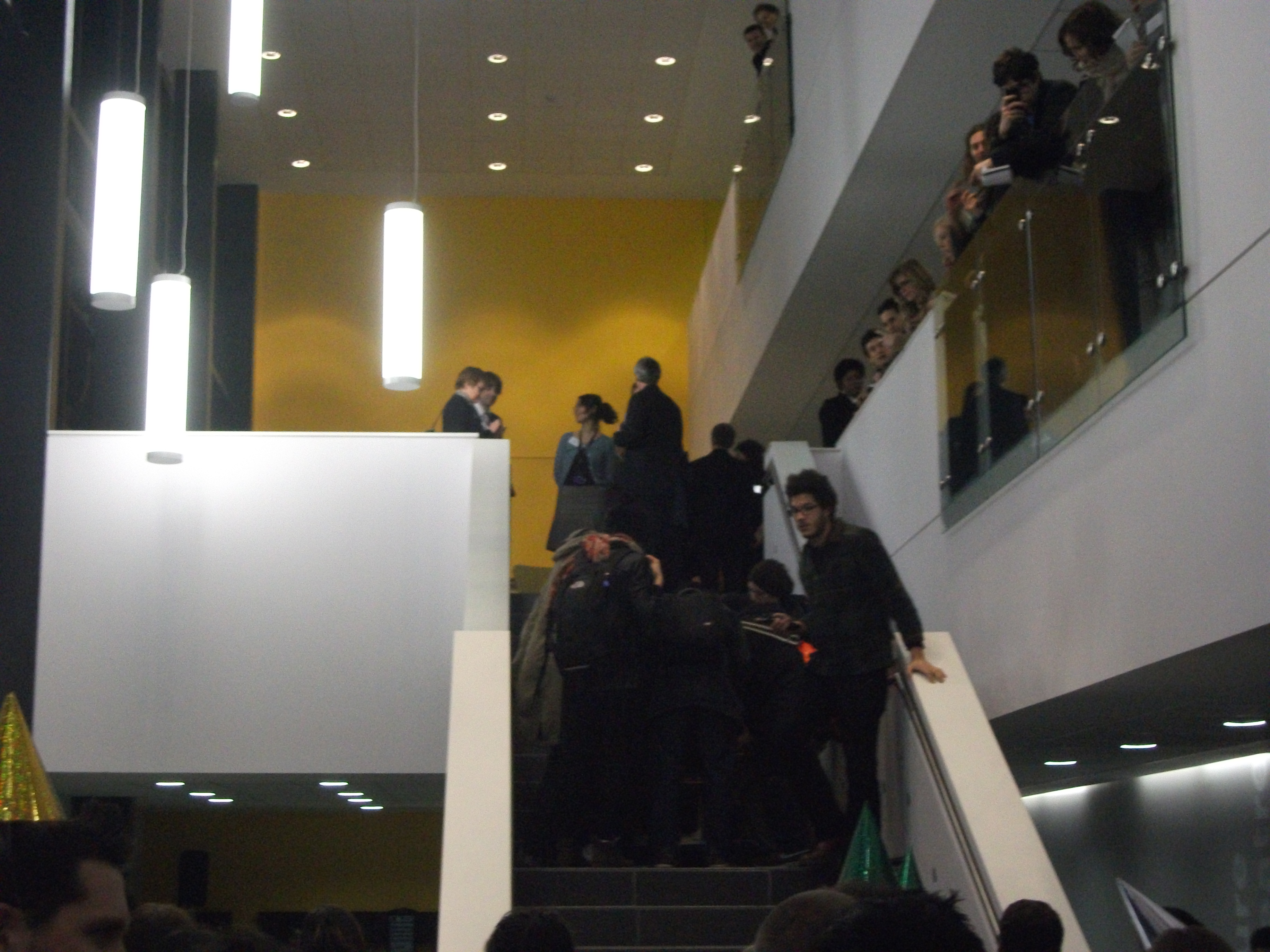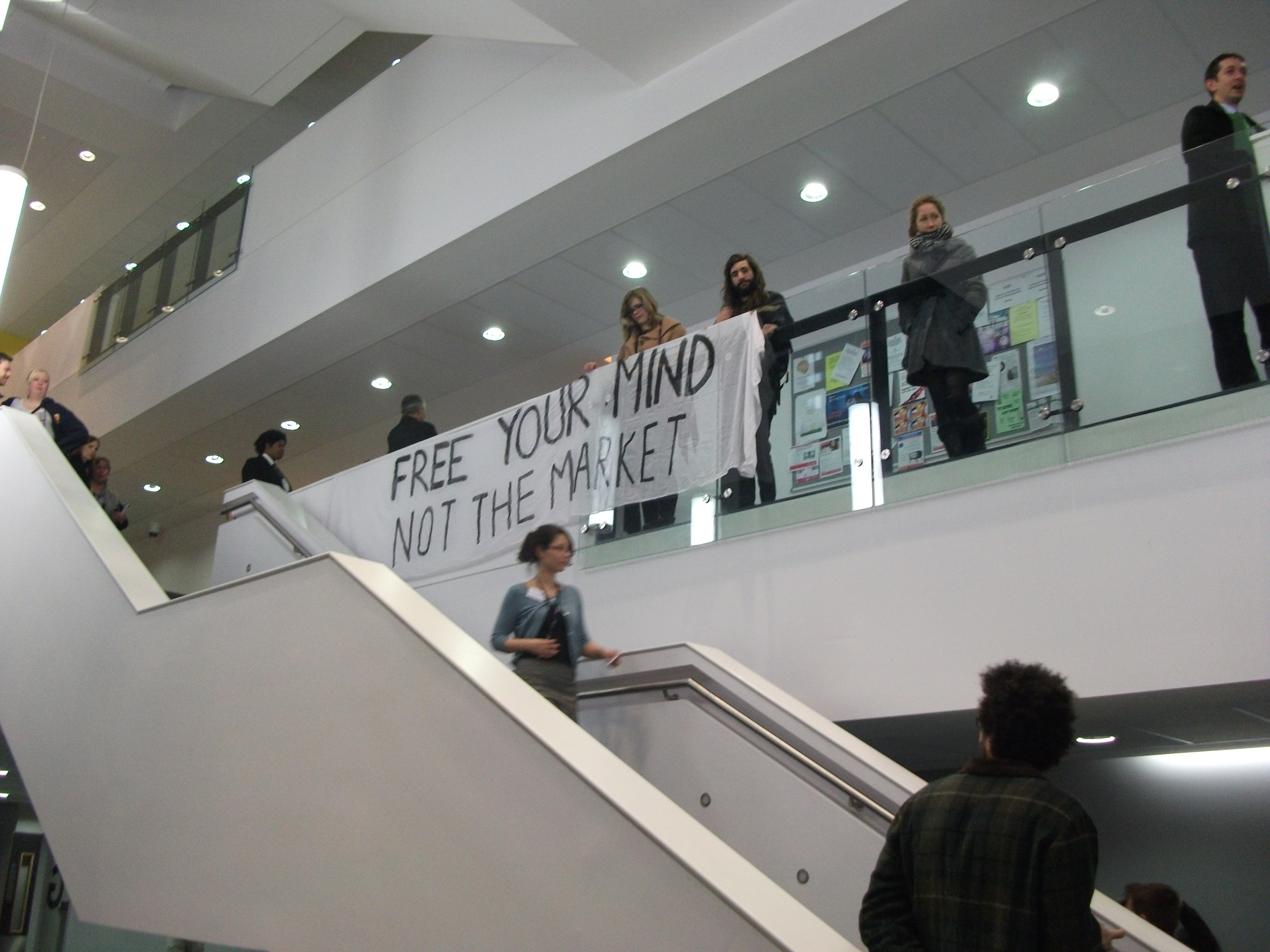 Most of the building was taken over, with bemused guests looking on. A few teaching staff attempted to patronise the students – generally the academic staff failed to think about why the students didn’t want a higher education system directed by the extremely wealthy with no critical independence. The danger of corporate interests sponsoring and determining how higher education is funded is that certain subjects will always be deemed more ‘competitive’ and quantifiable. Consider what are called the ‘STEM’ subjects celebrated by BP Chairman Lord Browne in his report – Science, Technology, Engineering and Mathematics. Although sometimes crucial to state infrastructure, there are enough global graduates emerging from these competitive fields, and the UK is already over-represented by graduates in these areas. Furthermore, making these areas a priority at the expense of others is naive, for whilst many thrive on corporate sponsorship, many are already in serious problems as a result of research cuts – consider the severely debilitating reduction in neuroscience research in the UK. The danger is that less profitable subjects like the humanities, social sciences and the arts, those which produce and maintain so much of our cultural life, will be forced into further decline and into the hobby subjects of international students and the rich. There is not enough space here to demonstrate the desperate need for cultural production and reflection in English society which is suffering from some serious neuroses, though in hindsight the protesters could’ve done much more (and much more intellectually) to make their cause and concerns known.