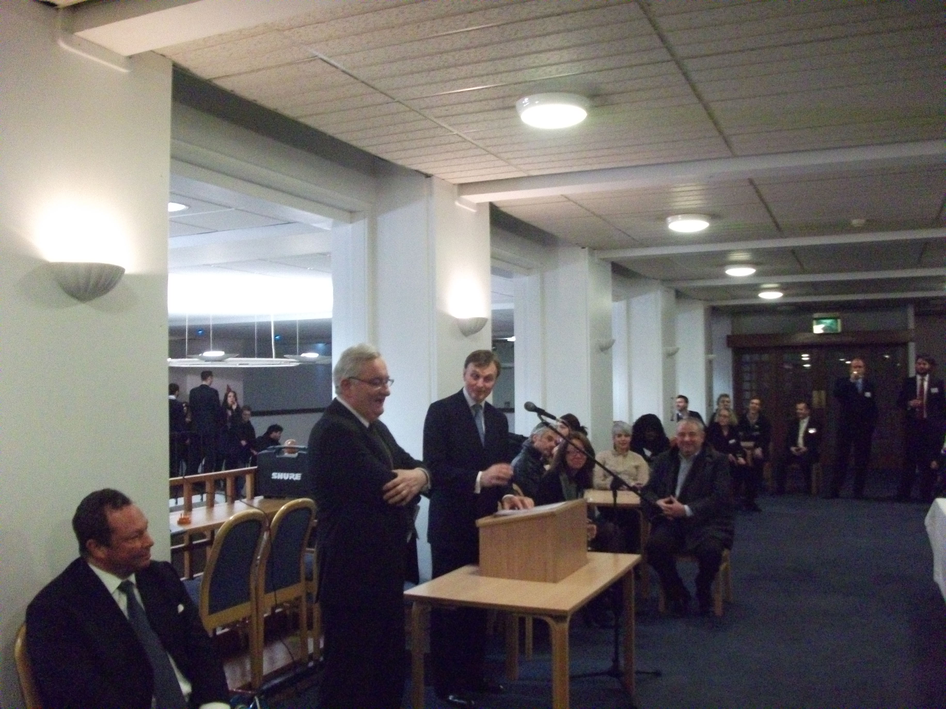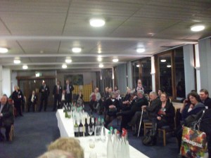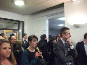 We skip ahead in time. A few members of our number of profoundly suspicious nature feared the party was being moved elsewhere. Aghast at the prospect of their peers missing out on the fun times, they traced the opening do now relocated to a totally irrelevant part of Goldsmiths. The students managed to break in and bring Archie Norman’s speech to a halt, perhaps to the relief of his guests, pictured below.