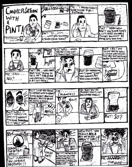 A dark effort which defined the style I’ve been working in since, and a solo project too. J’en Ai Marre means ‘I’m fed up’, and this one uses stark monochrome to achieve a harsh effect. Inside is a Down and Out booze review of what’s commonly referred to as ‘tramp’s lager’ or ‘rat’s piss’, alongside a biscuit review, an anatomy of lust, some comics, a poem about the A-Z, a stoic swansong and a couple of nihilistic spleen-splutterings.