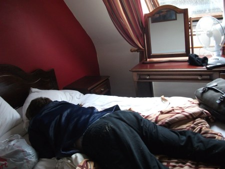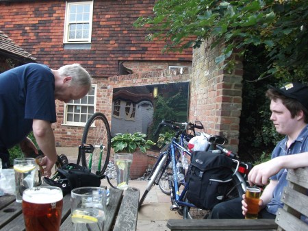 Very hard work, with the bicycles bearing the brunt of the damage – flat tyres on ancient nails, broken brakes – as we discovered the next day, I’d spent the last 5 miles of the first day with the front-brake partly on. This included cycling up a great hill, turning the final descent into Canterbury into a painful experience of near-religious ecstasy. We eventually became completely lost, joining up with the old A2 for a short while, the pilgrim’s route into Canterbury, past lovely pubs full of dreadful golf aficiandos and boarded up schools. For a while we cycled along (and for short while, on) the motorway – aie! – but by the evening we’d made it to Canterbury.