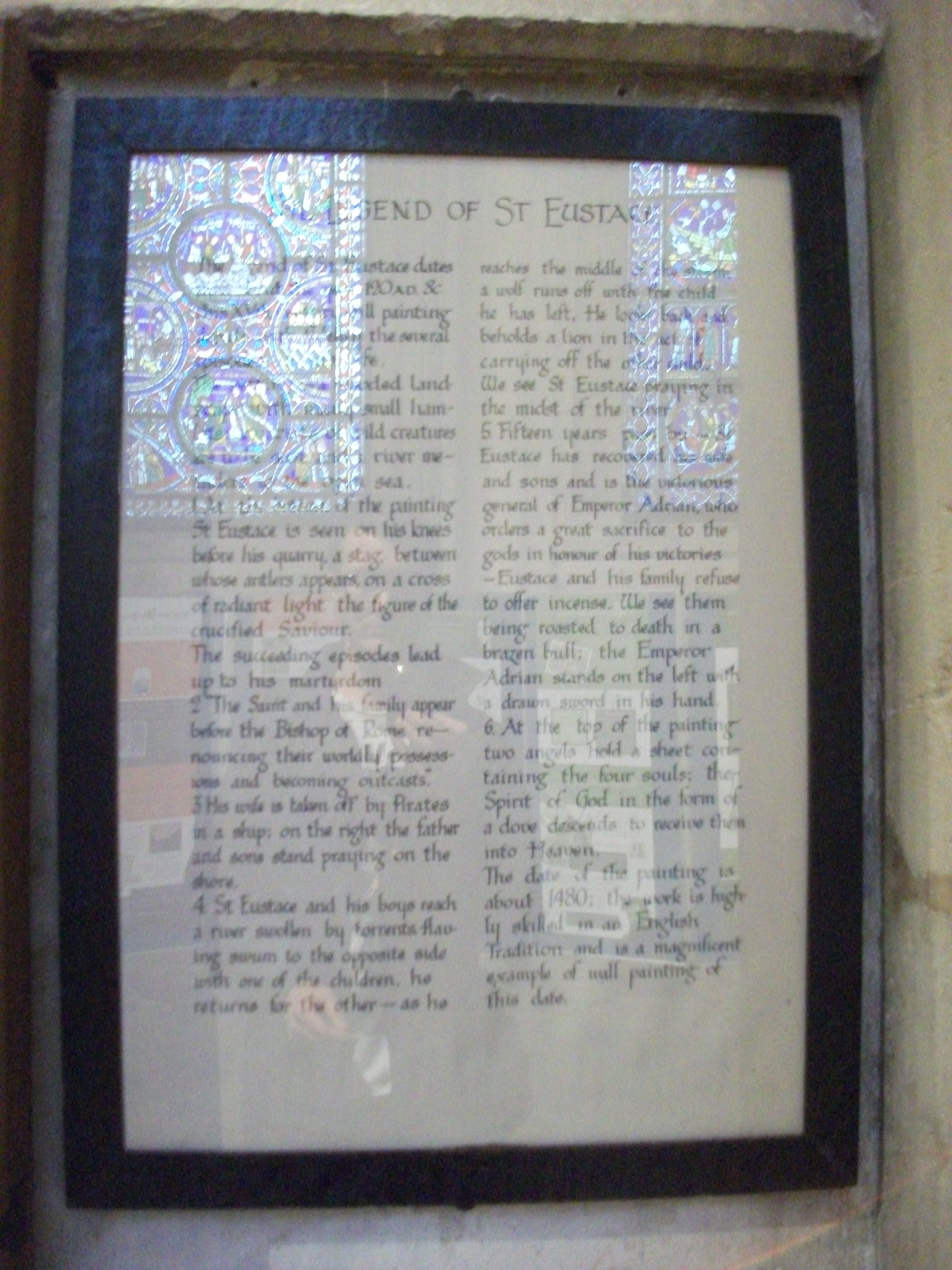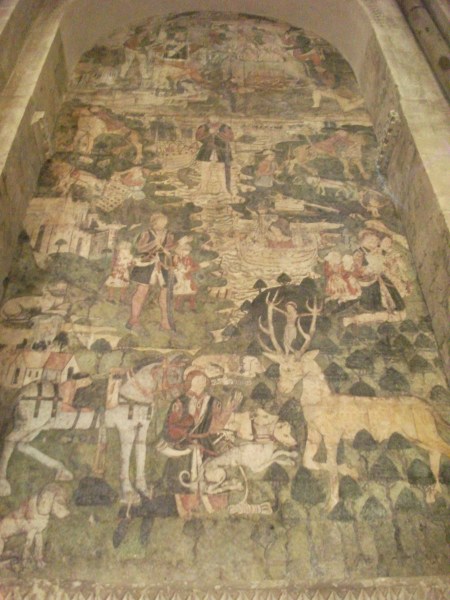 Saint Eustace’s story is a tragic one, though only in a Judao-Christian sense, like that of the Book of Job, one where bruised penitents are to learn from his example of pain and suffering for the Lord. The Greek name Eustace suggests fecundity, abundant in grain, and his story is ripe with pagan motifs – a Roman general, whilst hunting one day he saw a minitiure version of the suffering Christ in between the antlers of a stag he was hunting. This vision inspired him to abandon his post and possessions in favour of Christianity, becoming an outcast. Soon a series of cruel misfortunes strike him – his wife is captured and enslaved by pirates. Soon after, his two boys are captured by a wolf and a lion, curiously depicted in human form in the Canterbury mural, which also contains a bestiary of medieval monsters – frogs, mutants, demons erupting out of the fertile landscape. Eustace laments – of course, surely a sign no? But 15 years on he is now a successful general under Emperor Hadrian, united with his family when – lo! – the family refuse to participate in a sacrifice to the pagan gods. Enfuriated, Hadrian decided to burn the devouts alive in a brazen bull. The caption and mural ensure a happy life thereafter in heaven, but sheesh. A mural of profound submission, an awful but compelling monument to man’s misfortune.