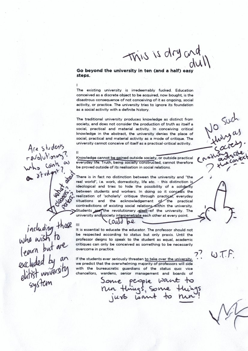 How convincing these strategies are depends on your politics. Some find the arguments alienating, too extreme. Some of the writing is very caustic, almost desperate in its anger, but this forgets that it’s a very funny book too. It’s a sarcastic humour, but there’s laughter involved. The real joke and the point of opposition and beginning something new comes from the students though, of course. There is hope, if students can work together and understand how power relations operate in the classroom, in the learning relation and so on. These power relations can’t go away – the idea of non-hierarchical groups is a total fantasy, purported usually with hierarchical intentions in mind – but they can be worked around and side-stepped, if students set up alternative spaces for learning, reading and working together. The world-weary cynicism in parts of the book also points to things students should avoid – internships, sex work, joining a peaceful protest group, simply accepting and justifying how things are with cynicism. No no. All that is blather. Try something else.